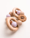 bijtring in zachte kleuren met leuke bloemenkraal en 2 houten ringels
